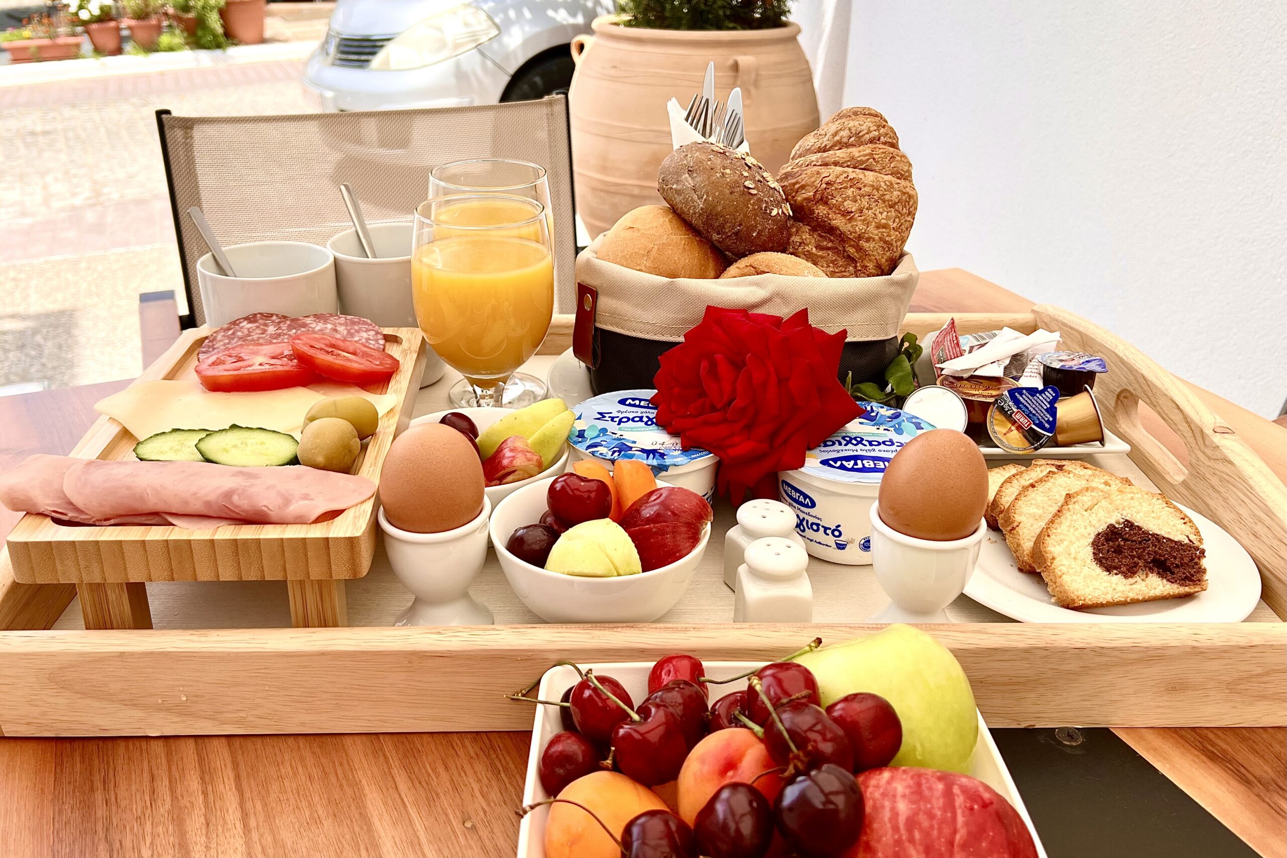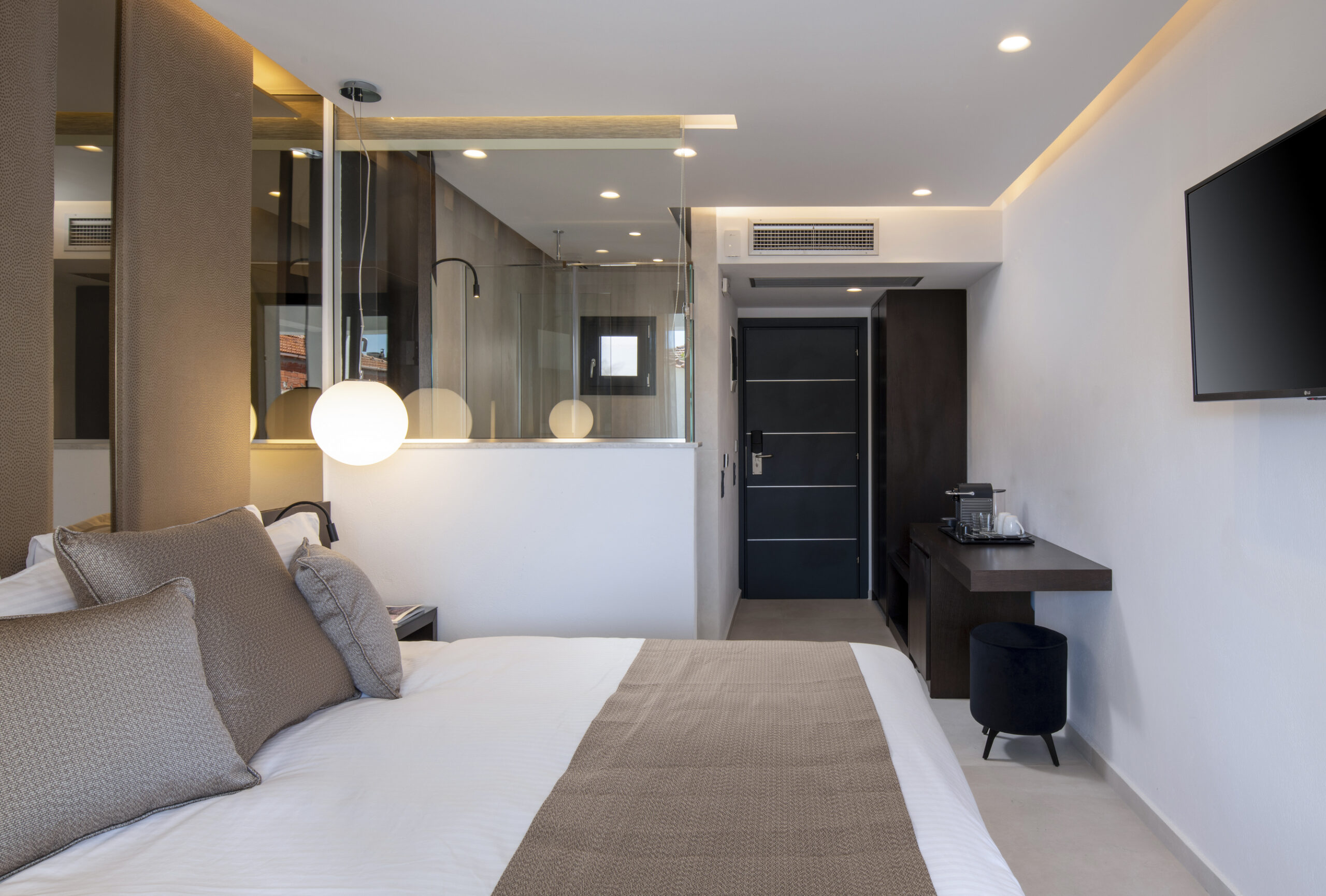Alexandrion Appartements Down Town befindet sich sehr zentral ca. 100 Meter vom Dorfplatz und ca. 100 Meter vom Hauptstrand entfernt. Das Haus wurde 2023 neu in modernem Design gebaut und wird erstmals ab Juni 2023 vermietet werden. Exklusive Deluxe Appartements mit einzigartigem Design. Jedes der 9 Appartements ist im Boutique-Style unterschiedlich gestaltet und hochwertig ausgestattet. Alle unsere Betten sind von "CocoMat" und haben die höchste Qualität. Das ganze Bett vom Bettgestell bis zur Bettdecke ist aus Naturmaterialien. Bettuntergestell „Kouros“, Matratze Atlas, 1. Bett Topper „Iviskos“, 2. Bett Topper „Kyriaki“ 2x Kopfkissen „Morfeas“ und 2x Kopfkissen „Narkissos“ dazu Daunendecke „Alkeos“ und Wolldecke „Kleon“ Das Mobiliar wurde von den Möbeltischlern mit hochwertigem Holz nach Maß angefertigt. Die teils offenen Bäder haben den höchsten Standard. Alle Appartements sind an einer geräuschlosen zentralen Klimaanlage angeschlossen und können individuell gesteuert werden. Die Türen können mit einer Karte oder mit dem Mobiltelefon geöffnet werden. Alle Appartements verfügen über W-LAN, Smart/ SAT TV, einen Schreibtisch/ Arbeitsplatz, einen im Schrank integrierten Kühlschrank, einen versteckten Safe, eine Nespresso-Kaffeemaschine, Wasserkocher, Tee, Kaffee, Bad-Pflegeprodukte, Bademäntel, Hausschuhe, Haarfön, Dampfbügeleisen, Wäscheständer (an Balkonwand). Auf Wunsch servieren wir Ihnen gern ein Kontinentales Frühstück.